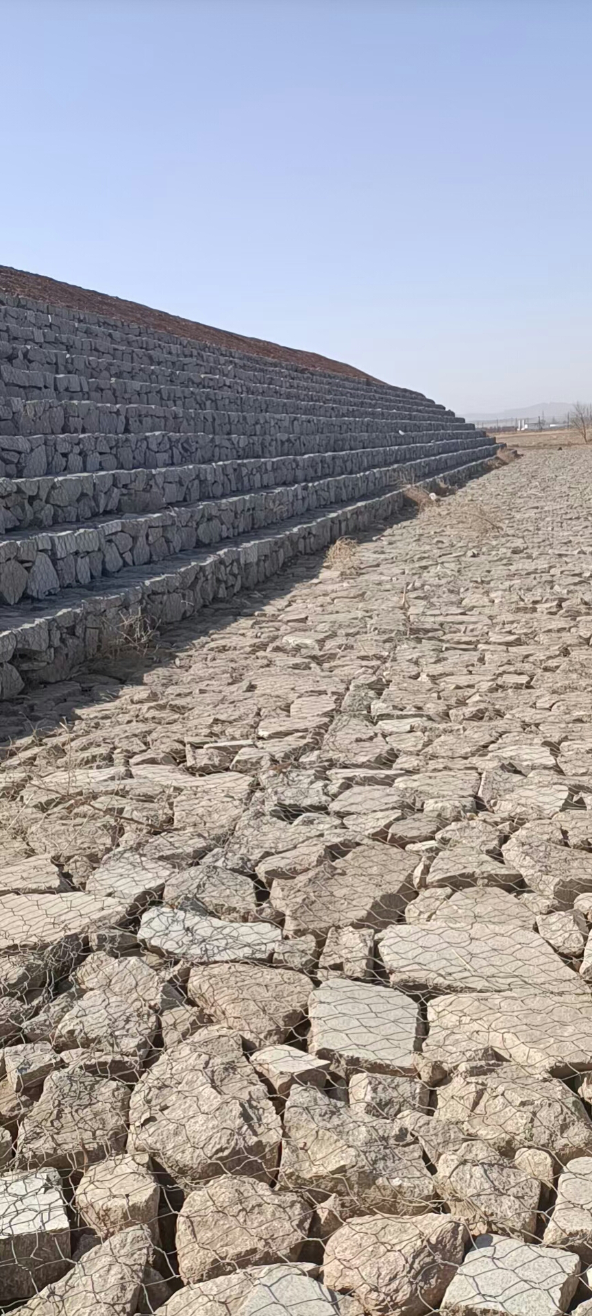 (3)將組長(zhǎng)好的籠體安裝在所需的位置上,并與相鄰的籠體綁扎連接,將準(zhǔn)備好的石塊或卵石填入籠中,要作適當(dāng)?shù)拇a排,以達(dá)到較高的密實(shí)度,石塊直徑一般須大于網(wǎng)目的兩倍,石塊要選用抗風(fēng)化能力強(qiáng)的石料。用拉筋來(lái)保持籠體形狀的規(guī)整,拉筋間距一般在300mm左右。