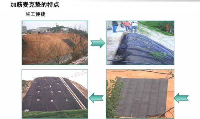施工方便:加筋麥克墊可按設(shè)計(jì)意圖,工廠化生產(chǎn)制作出半成品,施工現(xiàn)場則按設(shè)計(jì)圖進(jìn)行組裝定型,操作簡便、受氣候干擾小,且適宜于機(jī)械化操作,既可保證施工質(zhì)量又可加快工程進(jìn)度。