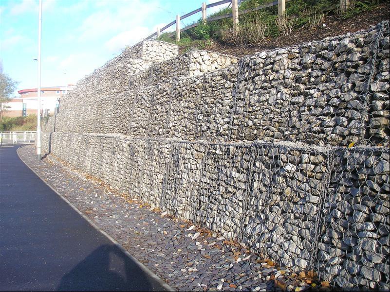格賓網(wǎng)擋土墻:是將契合粒徑要求的石料填入具有柔性的格賓網(wǎng)箱中到達必然的孔隙率、逐層砌筑的一種新型的柔性擋土修建物。格賓擋土墻合用于受水流沖刷和風(fēng)波侵襲,且防護工程根底不易處置或沿河擋土墻、坡腳根底部分沖刷深渡過大的沿河路堤坡腳或護岸。因而石籠網(wǎng)擋土墻作為一種新型的擋土構(gòu)造,以其造價低、生態(tài)性好、合用局限廣、柔性變形等特點獲得了越來越多的使用。