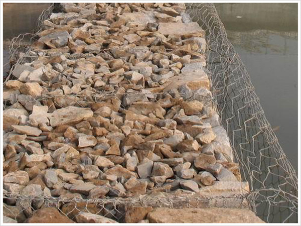 (3)將組長好的籠體安裝在所需的位置上,并與相鄰的籠體綁扎連接,將準(zhǔn)備好的石塊或卵石填入籠中,要作適當(dāng)?shù)拇a排,以達(dá)到較高的密實(shí)度,石塊直徑一般須大于網(wǎng)目的兩倍,石塊要選用抗風(fēng)化能力強(qiáng)的石料。用拉筋來保持籠體形狀的規(guī)整,拉筋間距一般在300mm左右。