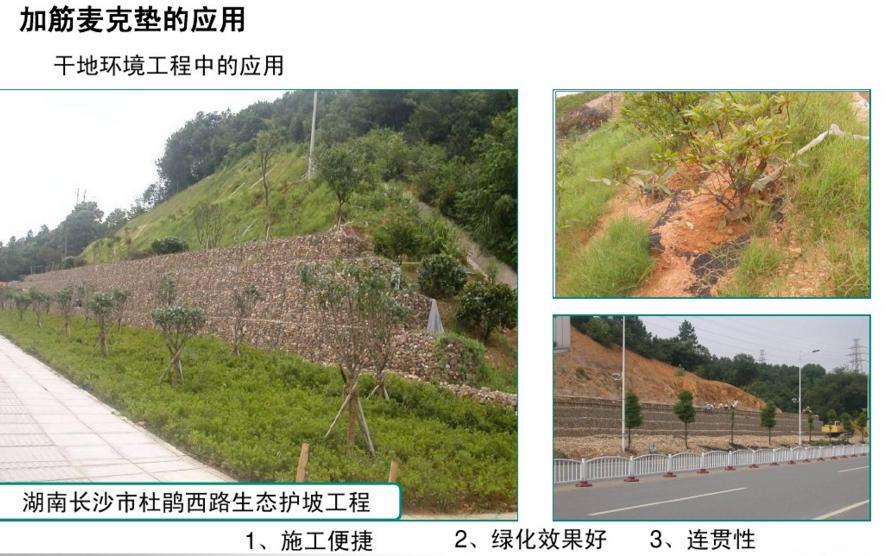 鍍高爾凡加筋麥克墊屬于組合式產(chǎn)品,土工材料與綠格網(wǎng)相結(jié)合而成,兼具土工材料及綠格網(wǎng)的優(yōu)點。土工材料為聚丙烯材質(zhì),綠格網(wǎng)鋼絲通常選用防腐性能好的鍍10%鋁鋅合金鋼絲。被廣泛應(yīng)用于生態(tài)自然恢復(fù),市政景觀工程,河道邊坡防護,公路、鐵路路基坡面穩(wěn)固工程。