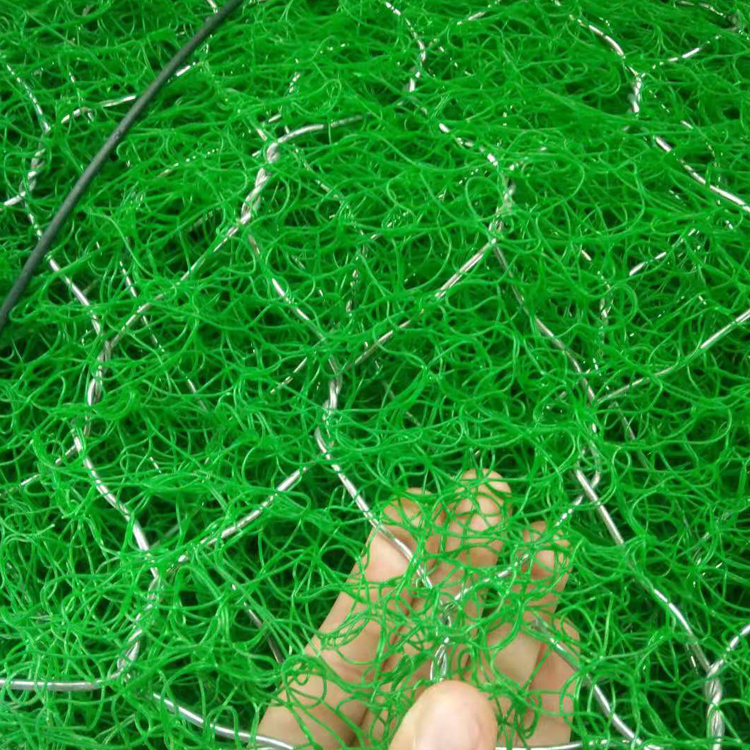 1、加筋三維植物網(wǎng)墊是聚丙烯經(jīng)過(guò)擠成單絲后無(wú)規(guī)則的疊成一定厚度并且通過(guò)熱黏結(jié)成土工網(wǎng)墊,具有開敞式的三維空腔結(jié)構(gòu),孔隙率大于90%,同時(shí)通過(guò)專門的設(shè)備,將各種鍍層(鍍鋅、鍍高爾凡、鍍鋁鋅合金、PVC覆塑)的雙絞合六邊形金屬網(wǎng)復(fù)合到柔性墊中。